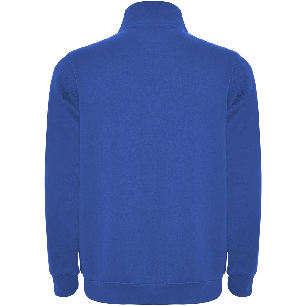 Sweatshirt mit passendem halben Reißverschluss und Polokragen. Passender Innenkragen. Verstärkte, abgedeckte Nähte am Innenkragen. 1×1 Rippbündchen an Ärmeln und Taille. Das Modell ist 185 cm groß und trägt Größe M.
