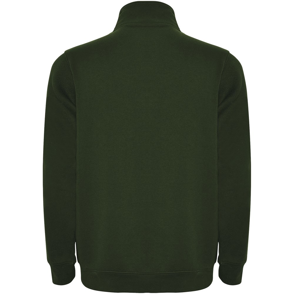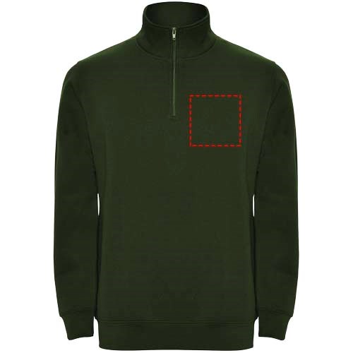 Sweatshirt mit passendem halben Reißverschluss und Polokragen. Passender Innenkragen. Verstärkte, abgedeckte Nähte am Innenkragen. 1×1 Rippbündchen an Ärmeln und Taille. Das Modell ist 185 cm groß und trägt Größe M.