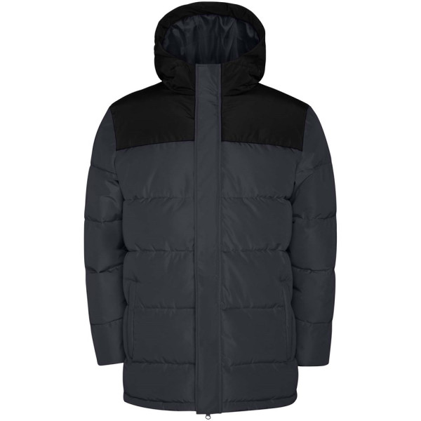 Wattierte Jacke mit fester Kapuze. Reißverschluss auf der Vorderseite, verdeckt durch eine Knopfleiste. Kinnschutz. Zwei Seitentaschen mit Reißverschluss. Elastische Bündchen.