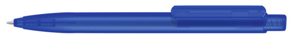 Druckkugelscheiber mit transparent gefrostetem Gehäuse, Clip und Drücker aus recyceltem ABS Kunststoff. Eingelassene Griffzone.