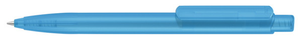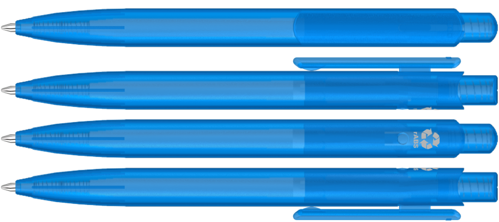 Druckkugelscheiber mit transparent gefrostetem Gehäuse, Clip und Drücker aus recyceltem ABS Kunststoff. Eingelassene Griffzone.