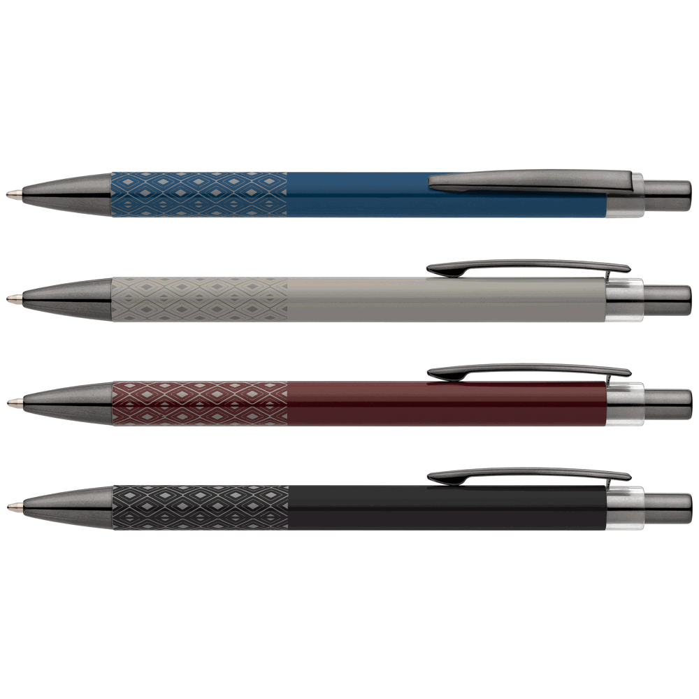 **Demnächst verfügbar – Ende Februar** Entdecken Sie ein modernes Schreibgerät, das alternative Materialien und anspruchsvolles Design auf harmonische Weise vereint. Dieser Klick- Kugelschreiber verfügt über einen eleganten, eloxierten Schaft aus recyceltem Aluminium. Der Griff ist mit einem dezenten Farbmuster bedruckt, das für eine verbesserte Haptik und einen stilvollen Look sorgt. Der Kugelschreiber besticht durch sein hochwertiges Design mit dunkel glänzenden Gunmetal-Oberflächen an Spitze, Druckknopf und Stahlclip, die einen schönen Kontrast zum farbigen Schaft bilden. Ausgestattet mit einer schlanken deutschen Dokumental-Tintenmine liefert dieser Kugelschreiber flüssige schwarze Tinte durch eine 1,0 mm Spitze und bietet eine zuverlässige Schreiblänge von 500 Metern, was ihn zu einem stilvollen und zuverlässigen Kugelschreiber für den täglichen Gebrauch macht.