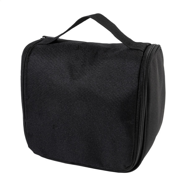 Kosmetiktasche zum Hängen aus RPET mit Reißverschluss-Innenfach sowie Netzfächern. Material: 600D RPET Polyester. Mit Label RPET.