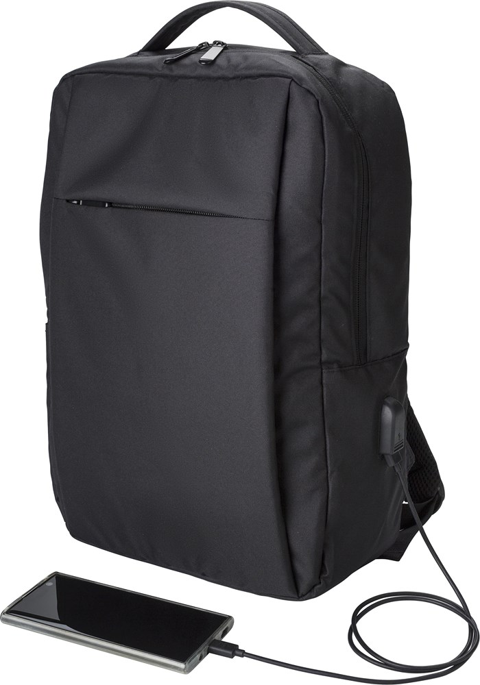 rPET (300D) Laptop (16 Zoll) Rucksack mit 210D Details. Innen mit mehreren Taschen, Laptop-Tasche mit Klettverschluss, eine Fronttasche mit Reißverschluss. Öffnung mit USB-A an der Seite.
