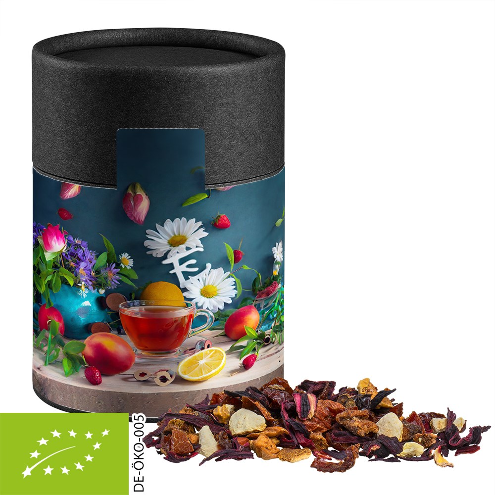 Bio Früchtetee gute Laune, ca. 50g, Kraftpapierdose Midi schwarz