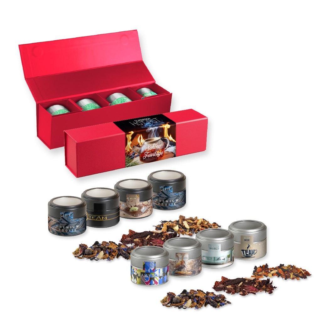 Verschiedene Weihnachts Teesorten, , ca. 120-140g, Geschenk-Set Premium rot mit Magnetverschluss und 4 Metalldosen Mini mit Sichtfenste