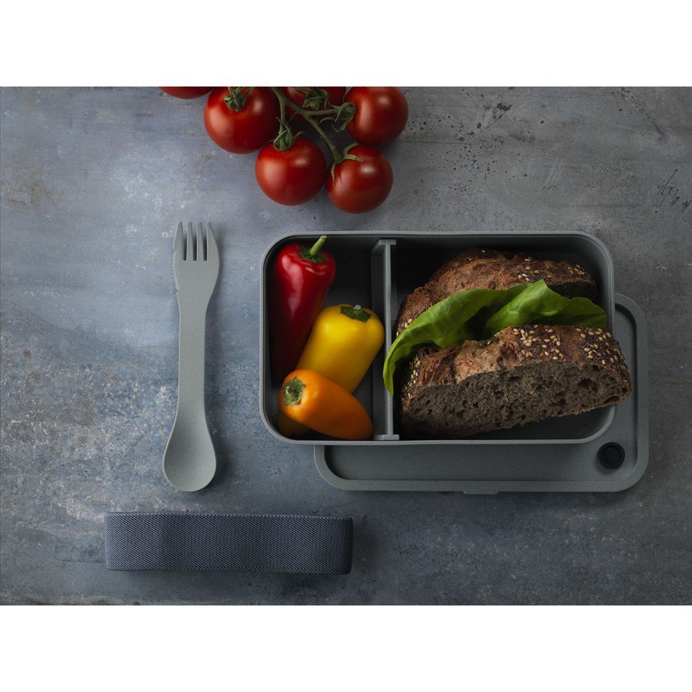 Lunchbox aus PP-Kunststoff. Der perfekt schließende Deckel hat einen Silikondichtring und eine Belüftungsöffnung mit Silikonkappe. Inklusive 3-in-1-Gabel, -Löffel und -Messer. Mit herausnehmbarer Trennwand und Verschlussgummi. Diese Box kann in den Kühlschrank gestellt werden und ist somit auch als luftdichte Frischhaltebox verwendbar. Geeignet für den Einsatz in der Mikrowelle und im Gefrierschrank. Nicht spülmaschinengeeignet.