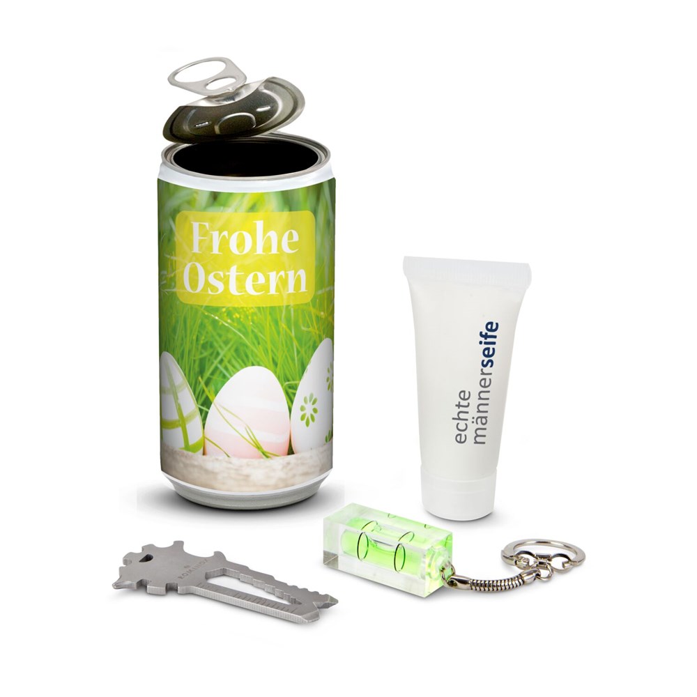 Was nicht passt, wird passend gemacht - eine echte Männerdose! Ob für den Kunden, Kollegen, Mitarbeiter oder Kumpel: mit dieser Dose machen Sie jeden Mann glücklich. Passend für viele Gelegenheiten wie z. B. Ostern. Der Inhalt: ein kreatives ROMINOX® Multitool (sortiert) als Schlüsselanhänger mit 18+ Funktionen und Key Tool Funktionsbeschreibung (verschiedene Designs je nach Verfügbarkeit), eine Mini Wasserwaage und eine 20 ml Tube Duschgel. An die Werkzeuge, fertig, los!