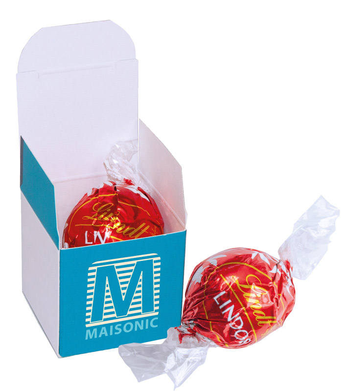 Bedruckte Würfelverpackung befüllt mit einer original Lindor Praline, einer original Ferrero... mehr