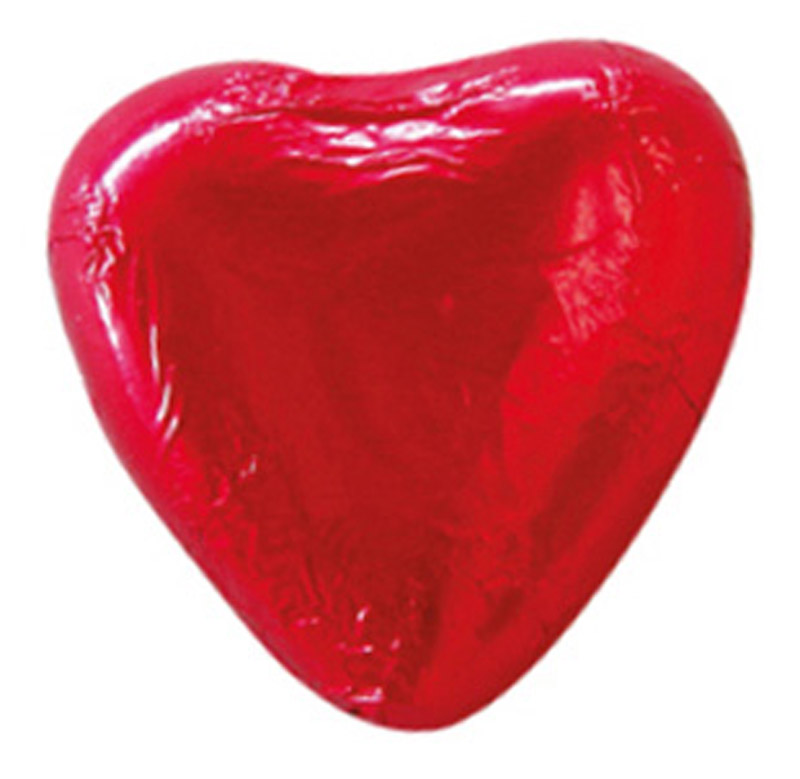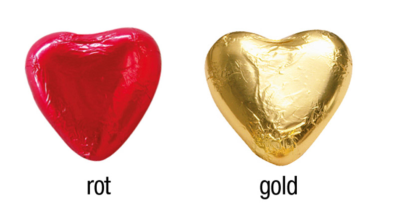 Massives Herz aus Edel-Vollmilchschokolade in roter oder goldener Folie verpackt mit einem individuell bedruckten Etikett.