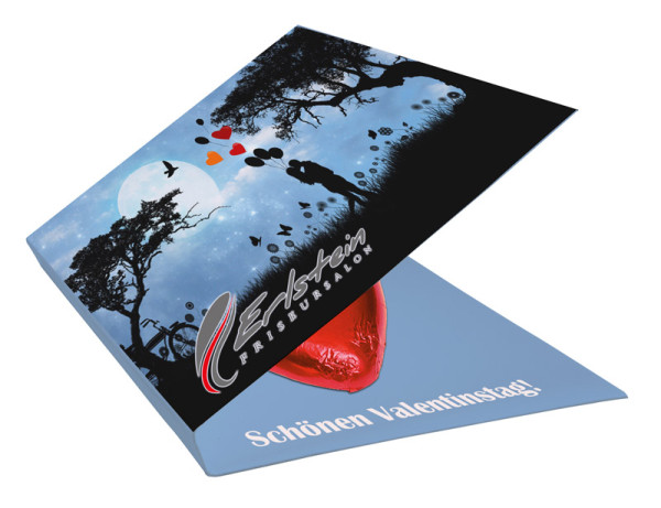 DinA7 Umschlag (geschlossenes Format) bedruckt mit Ihrer Werbebotschaft und einem angeklebten Schokoherz aus feiner Fairtrade Edelvollmilchschokolade. Der Umschlag wird beidseitig gedruckt.