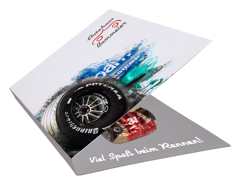 Beidseitig bedruckter DIN A7-Umschlag (geschlossenes Format) mit aufgebrachter Schokoladenfigur aus unserem Sortiment. Die Wahl der Schokoladenfigur treffen Sie individuell nach Ihren Wünschen.