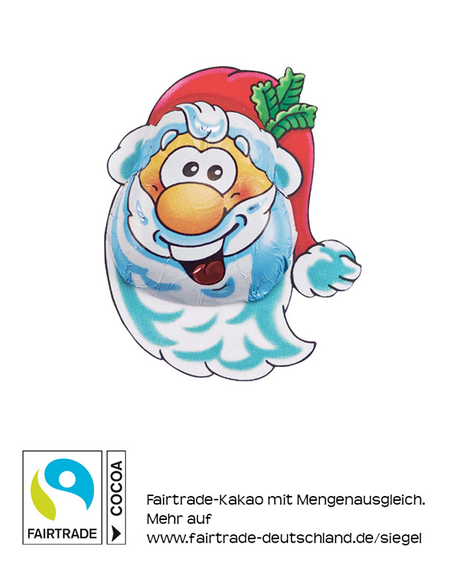 Schokoladen-Weihnachtsmann in bedruckter Folie. Fairtrade Edelvollmilchschokolade, mindestens 33% Kakao.