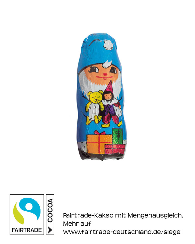 Schokoladen-Wichtelmännchen in bedruckter Folie. Fairtrade Edelvollmilchschokolade, mindestens 33% Kakao.