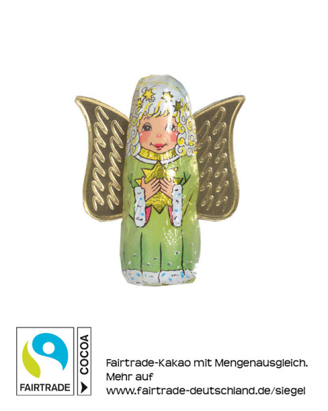 Schokoladen-Weihnachtsengel in bedruckter Folie. Fairtrade Edelvollmilchschokolade, mindestens 33% Kakao.