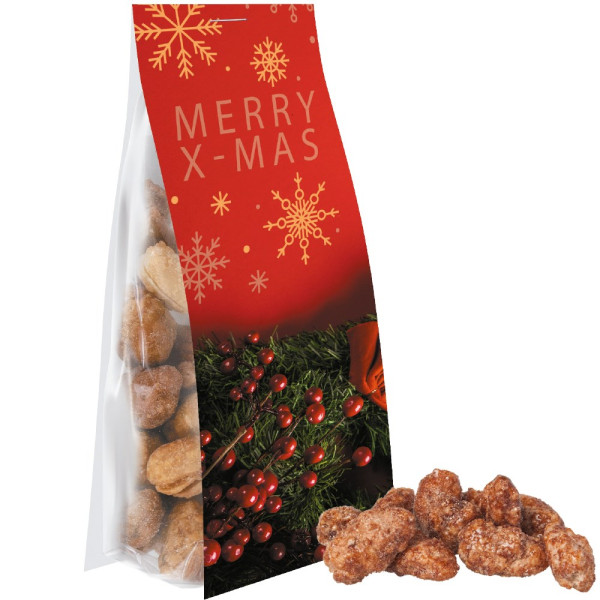 Feuergebrannte Mandeln, ca. 40g, Express Blockbodenbeutel mit Werbereiter