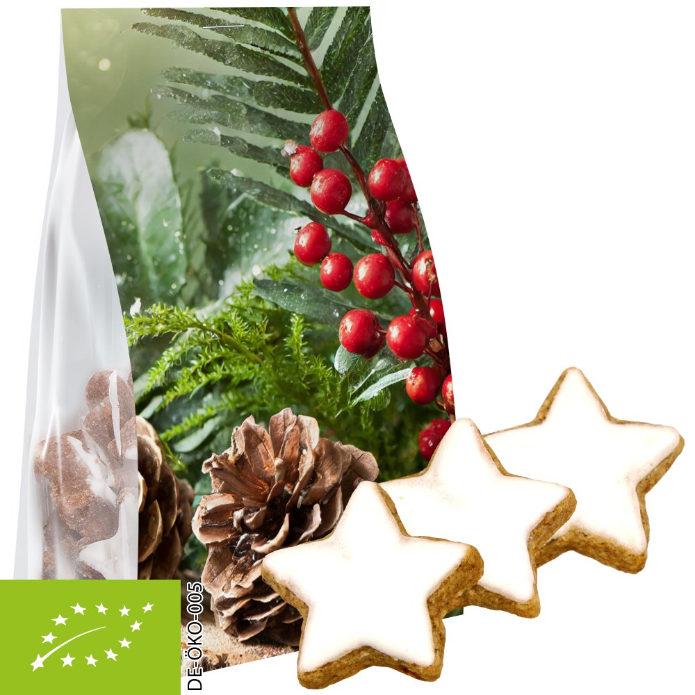 Bio Zimtsterne, 100g, Express Blockbodenbeutel mit Werbereiter