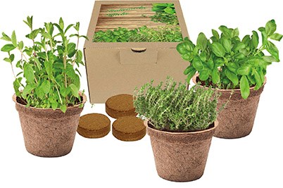 Drei ökologisch abbaubare Töpfe mit den typischen Kräutersamen für die italienische Küche: Basilikum, Majoran und Thymian. Der Werbedruck erfolgt auf dem Deckel-Etikett. Auch eine Gestaltung des Etiketts ist bereits ab 100 Stück möglich. Inhalt: 3 Töpfe aus Kokosfasern, 3 Holzstecketiketten, Erdtabletten, Samen: Basilikum, Majoran, Thymian