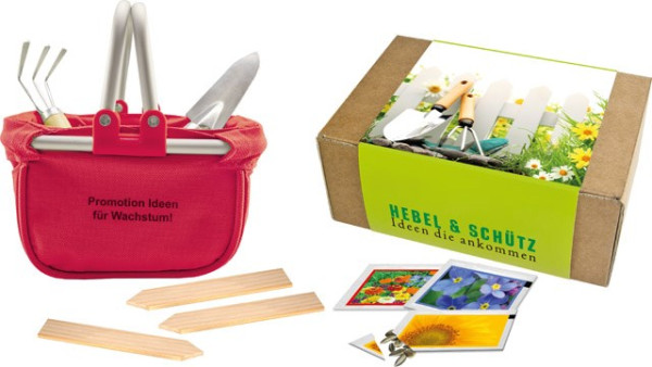 Der Utensilo „Garten“ ist perfekt ausgestattet für die erste Aussaat, mit einer handlichen Harke, Schaufel, Samentütchen (Zwergsonnenblume, Vergissmeinnicht, bunte Blumenmischung) und Holzstecketiketten. Der Werbedruck erfolgt auf dem Standardmotiv, ab 100 Stück ist eine individuelle Banderolengestaltung möglich. Inhalt: Gartengeräte (Harke, Schaufel, je ca. 17,5 cm), 3 Holzstecketiketten, 3 Samentütchen (je 80 x 55 mm) Samen: Zwergsonnenblume, Vergissmeinnicht, Bunte Blumenmischung