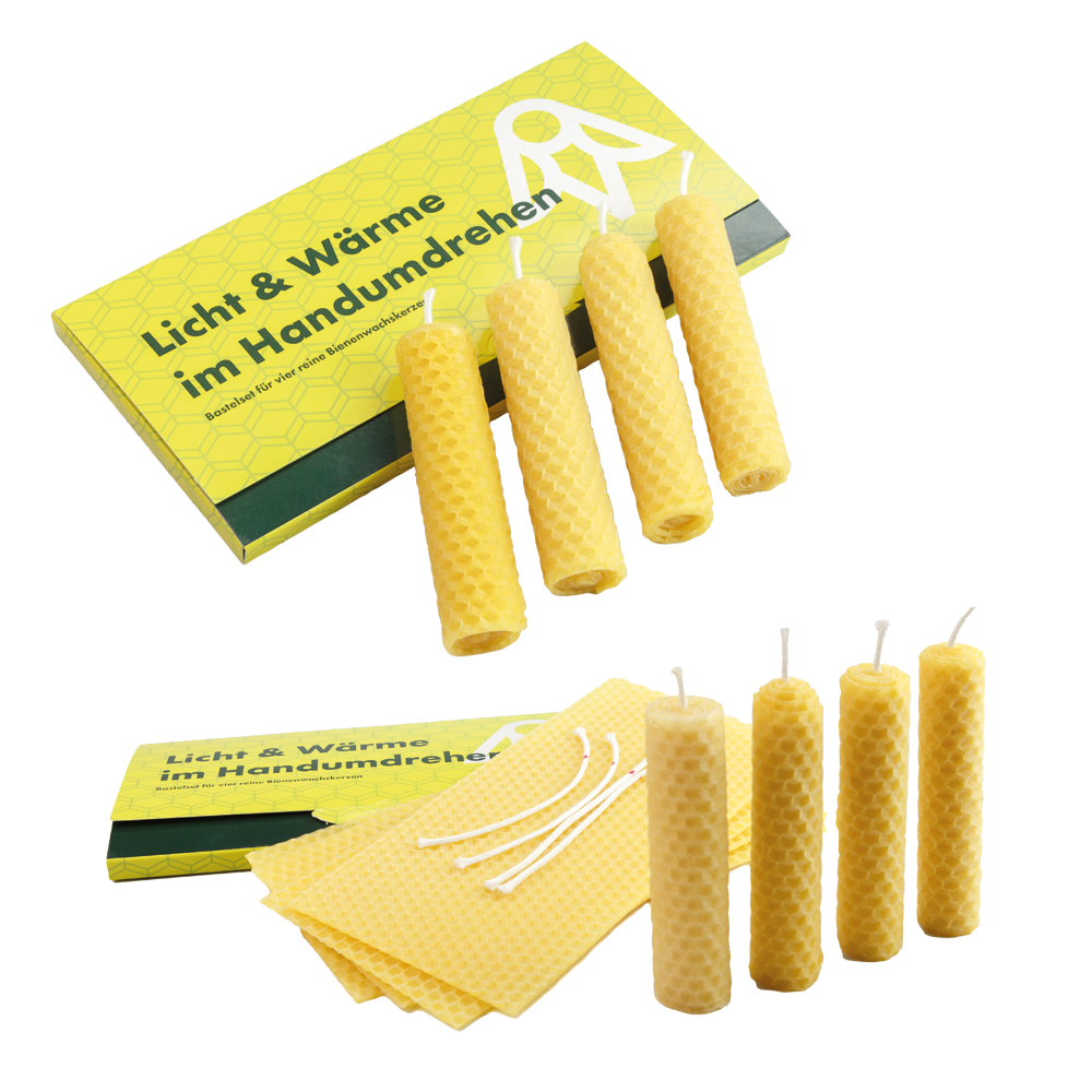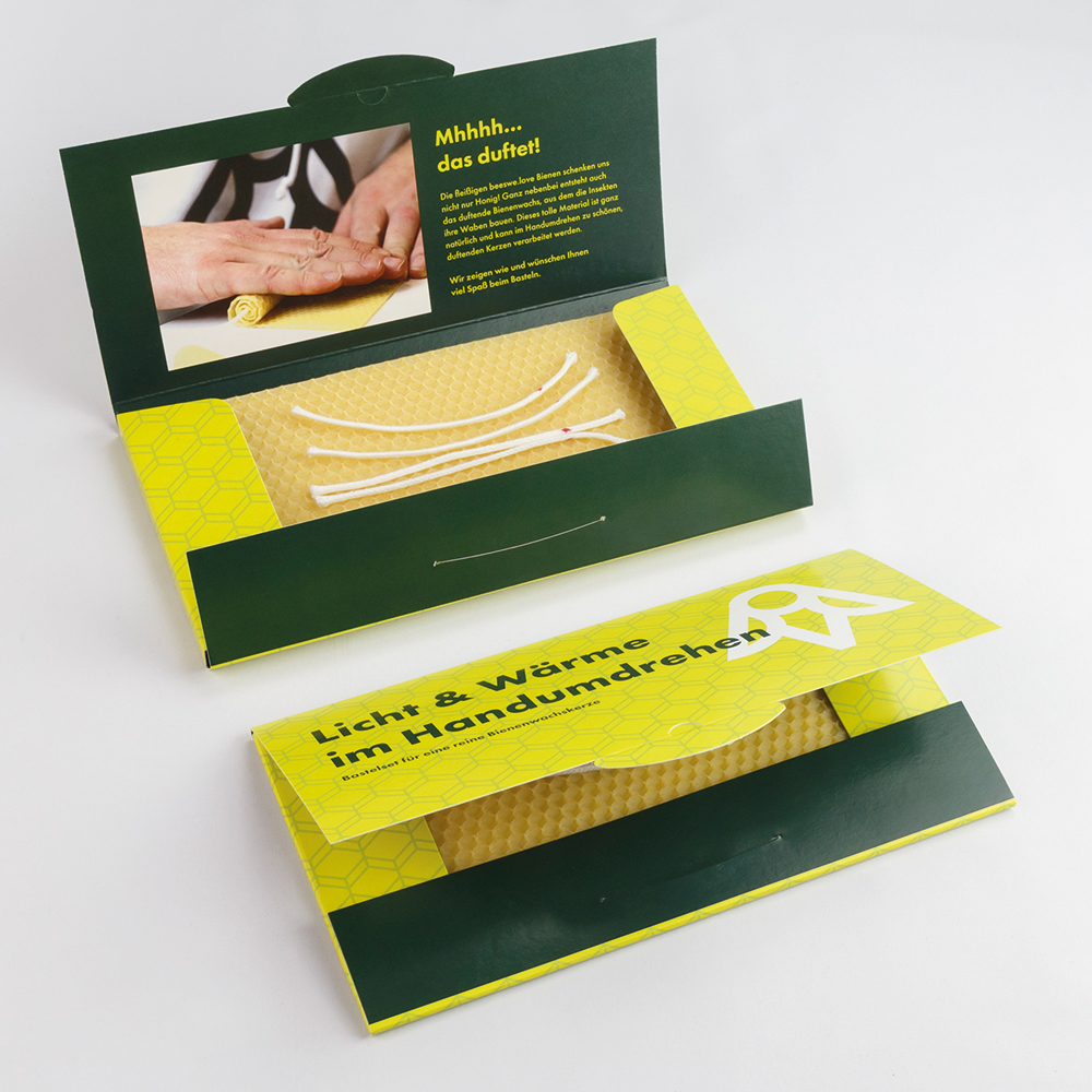 Kerzenbastelsets für vier reine Bienenwachskerzen. Ein Gruß voller Wärme und Licht für Ihr Klientel oder Ihre Mitarbeitenden. Das vielseitige Bienenwachs aus der beeswe.love Imkerei ist ein faszinierendes und reines Naturprodukt, das mit unseren DIY Bastelsets buchstäblich im Handumdrehen zu schönen, duftenden Kerzen verarbeitet werden kann. Wie geschaffen als Weihnachtskarte oder als Gruß in der Adventszeit. Mappe aus Karton für DIN lang mit einem Bastelset für vier Bienenwachskerzen. Fertig konfektioniert mit Anleitung und Sicherheitshinweisen. Ausgezeichnet mit dem Promotional Gift Award 2023.