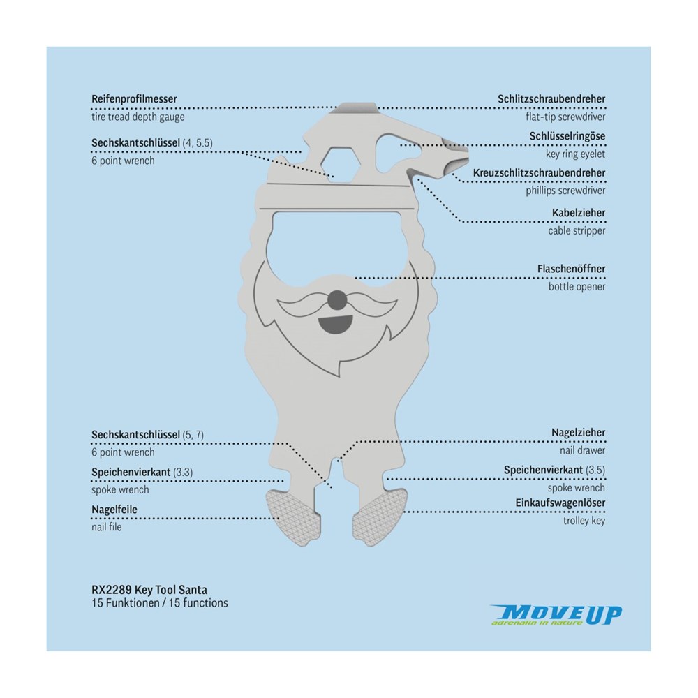 Multitool (aus robustem Edelstahl) für den Schlüsselbund inkl. Funktionsbeschreibung und Standard-Kartonverpackung, kundenindividuelle Verpackung und Funktionsbeschreibung ab 100 Stück möglich. In verschiedenen Standarddesigns verfügbar. Key Tool als Schlüsselanhänger mit 15 Funktionen: 4 Sechskantschlüssel, 2 Speichenvierkant, 1 Schlitzschraubendreher, 1 Nagelzieher, 1 Einkaufswagenlöser, 1 Kreuzschlitzschraubendreher, 1 Kabelzieher, 1 Flaschenöffner, 2 Reifenprofilmesser (1,6 mm und 4 mm), 1 Nagelfeile - ab 3.000 Stück auch als Sonderproduktion mit individueller Key Tool Form möglich. Sprechen Sie uns an!