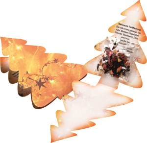 Das Klappkärtchen in der Form eines Weihnachtsbaumes. Eingelegt im Tütchen ist ca. 2 g Weihnachts-Früchtetee, ausreichend für 1 Tassen Tee. Ein Genuss in der Advents- und Weihnachtszeit. Platz für den Werbedruck ist auf dem Standardmotiv der Karte oder eine eigene Gestaltung, jeweils ab 500 Stück.