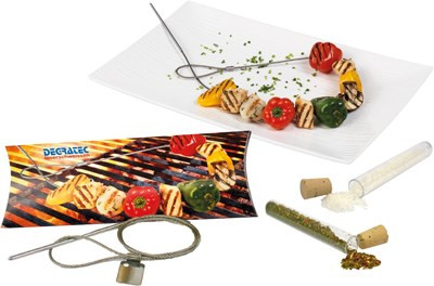 Unsere BBQ-Box enthält Grillkräuter und Meersalz für die deftige Zubereitung von Speisen. Speziell zum Grillen oder Braten in der Pfanne ist ein Grilldraht enthalten, auf dem sich leicht Fleisch oder Gemüse aufspießen lassen und der nach dem Gebrauch wiederverwendbar ist. Alles ist schön und handlich verpackt in der Geschenk-Box. Platz für den Werbedruck ist auf dem Standardmotiv der Packung oder eine eigene Gestaltung der Packung, jeweils bereits ab 100 Stück.