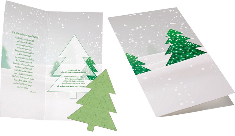 Der Tannenbaum enthält bereits Fichtensamen. Einfach auf das Erdreich legen, mit etwas Erde bedecken und gießen. Schon nach wenigen Tagen sprießen die ersten Keimlinge. Ab 100 Stück ist Ihre Werbebotschaft auf dem Standardmotiv oder die individuelle Gestaltung der Karte möglich. Ein Kuvert ist separat erhältlich, Artikel 6101