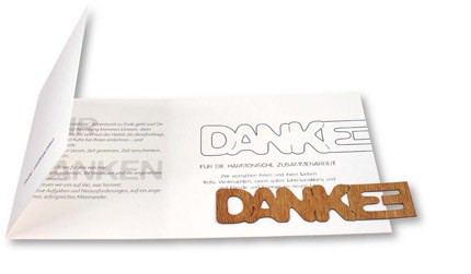 Mit dieser Weihnachtskarte können sie ganz einfach "Danke", z. B. für die harmonische Zusammenarbeit, sagen. Das Holzlesezeichen kann nachhaltig genutzt werden und ist so immer wieder präsent. Eigene Schriftzüge sind nach Vorlage ab 250 Stück möglich. Platz für den Werbedruck ist auf dem Standardmotiv der Karte oder eine eigene Gestaltung, jeweils ab 100 Stück. Ein Kuvert ist separat erhältlich, Artikel 6101