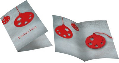 Eine Weihnachtskarte mit einer Weihnachtskugel aus rotem Filz (ca. Ø 6,9 cm), inklusive Aufhänger. Platz für den Werbedruck ist auf dem Standardmotiv oder eine eigene Gestaltung der Karte, jeweils bereits ab 100 Stück. Ein Kuvert ist separat erhältlich, Artikel 6101 Inhalt: Filzanhänger Kugel (ca. Ø 69 mm)