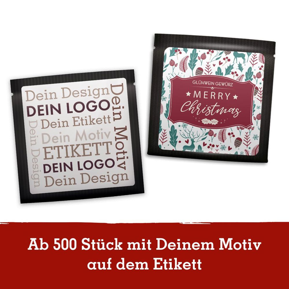 Ab 500 Stück mit Ihrem Design auf dem Etikett, ab 5.000 Stück mit Ihrer vollflächig bedruckten Folie: Die Gewürzmischung eignet sich ideal als originelle Mailingbeilage oder Give-away. Glühwein selbst machen: klassisch mit Rotwein, alkoholfrei mit Trauben- oder Apfelsaft und dem wellnuss Glühwein-Gewürz, das mit Zimt, Anis und Nelken Ihrem Heißgetränk eine ordentliche Portion Winterzauber verleiht. Dieser Artikel ist vegan, laktosefrei und glutenfrei.