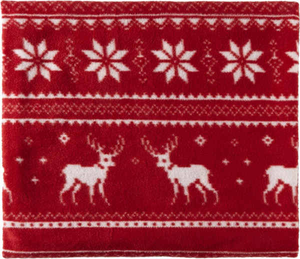 Decke 'Snuggle' aus Fleece (180 g/m²) im winterlichen Rentier-Design. Die Decke verfügt über einen Nylon-Tragegurt, der gleichzeitig als Werbefläche dient.