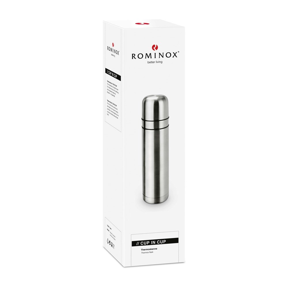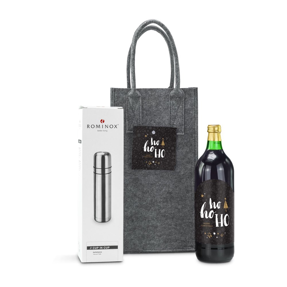 Eine stilvolle Kombination zur Weihnachtszeit: ein leckerer Glühpunsch (1 l, alkoholfrei) und eine moderne Isolierkanne mit zwei Bechern in einer praktischen ROMINOX® Tragetasche. Bei unserem alkoholfreien Glühpunsch in der klassischen 1 Liter Krugflasche mit "HoHoHo"-Etikett kommen Sie auch ohne Alkohol in den wunderbaren Genuss eines köstlichen, wärmenden Weihnachts- bzw. Wintergetränks in der kalten Jahreszeit. Hergestellt wird der Punsch aus Traubensaft und Wasser und geschmacklich abgerundet durch Aromen von Nelken, Zimt, Piment, Zitronen, Orangen, Heidelbeeren, Macis, Kardamom und Anis. Einfach nur erhitzen und schon können Sie den Punsch genießen oder für unterwegs in die ROMINOX® Isolierkanne gießen. Die Kanne aus Edelstahl (750 ml) hat einen praktischem Drehverschluss mit Drucköffnung und einen clever integrierten Zweitbecher. Beides kommt in einer hübschen ROMINOX® Filztasche in modern meliertem Grauton (veganes Filz aus 100% recyceltem PET, zertifiziert nach Global Recycling Standard) mit weihnachtlichem Anhänger, welche auch später noch als praktische Tragetasche nachhaltig im Einsatz bleibt. Auf Wunsch auch mit individuellem Anhänger.