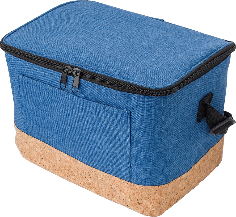 Kühltasche aus Polyester (600D) mit Reißverschluss und einem Boden aus Kork. Innenmaterial ist EVA. Die Tasche fasst sechs Dosen mit 0,5 Litern Inhalt.