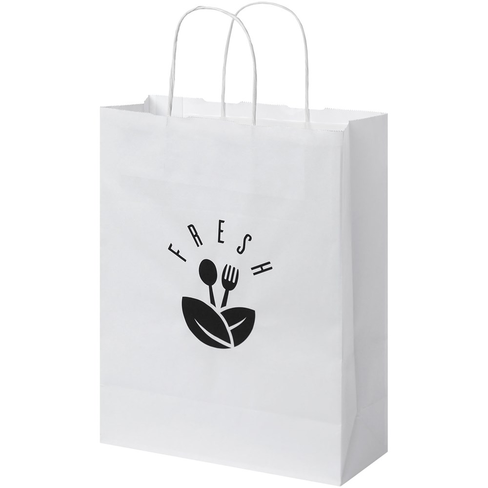 Mittelgroße Kraftpapiertasche (25 × 11 × 32 cm) mit gedrehten Griffen. Hergestellt aus verantwortungsvoll beschafftem Papier (weiß 90 g/m², braun 80 g/m²) ist diese Tasche eine robuste Verpackungslösung mit ausreichend Platz für verschiedenste Artikel. Die natürliche und rustikale Optik des Kraftpapiers verleiht jedem Anlass eine elegante Note. Ideal für Einkäufe, Geschenke oder Veranstaltungen – diese Tasche ist eine hervorragende Alternative zu Plastiktüten. Hergestellt in Europa.