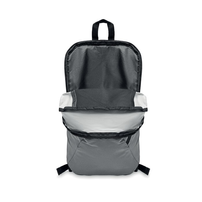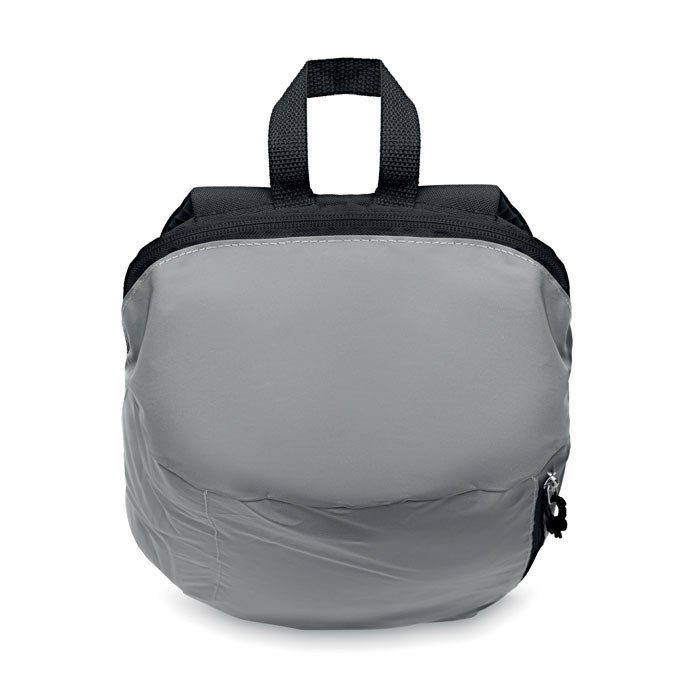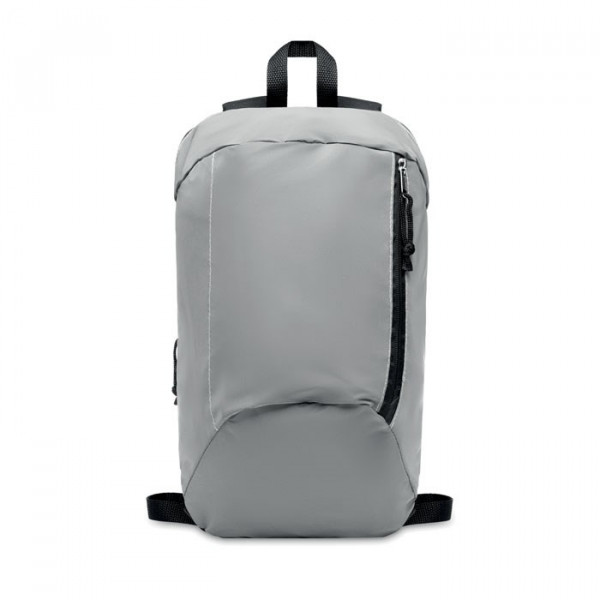 Rucksack mit Front aus hoch reflektierendem Polyester. Fronttasche mit Reißverschluss. Gepolsterte Rückseite. 600D Polyester.