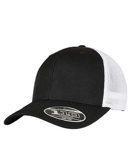 2-farbiges Trucker Cap | Transparentes Mesh | Blickdichte Vorderseite | Aus recyceltem Polyester | Vorgebogener, achtfach gesteppter Schirm | Integriertes Flexfitband | Snapback-Verschluss