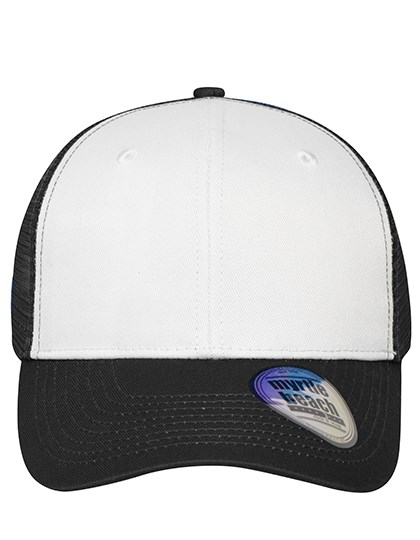 Trendige 6-Panel-Mesh-Mütze aus Polycotton | 8 Ziernähte auf dem Schild | 2 gestickte Luftlöcher an den vorderen Panels | Gefüttertes Schweißband | Größenregulierung durch "click & snap" Verschluss | Frontpanel: laminiert