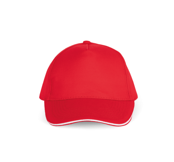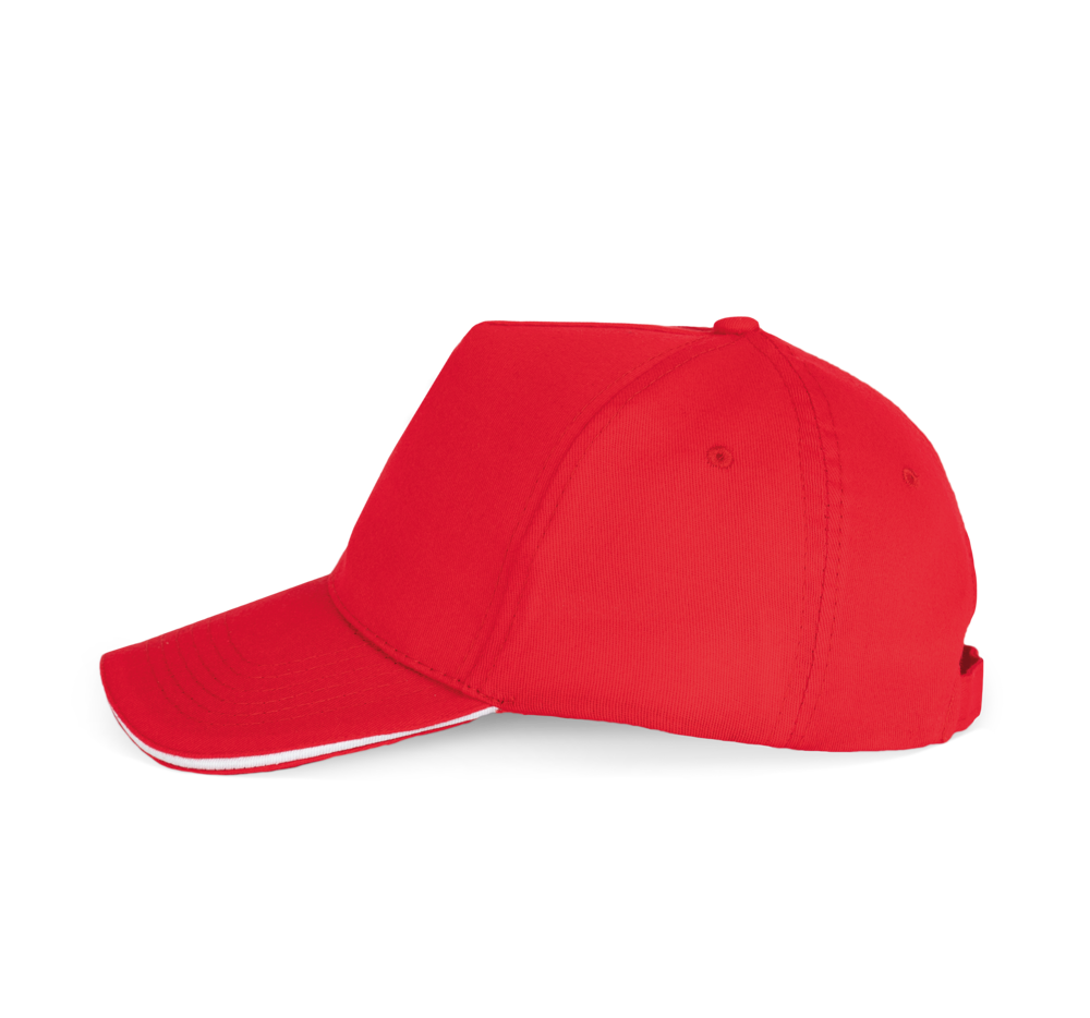 100% stark gebürstete Baumwolle. Laminierte 5-Panel-Kappe. Sandwichschirms mit kontrastfarbenem Mittelstück. Baumwoll-Schweißband. Größenverstellbar durch Metallschnalle.