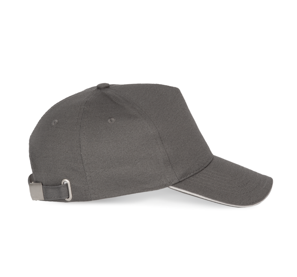 100% stark gebürstete Baumwolle. Laminierte 5-Panel-Kappe. Sandwichschirms mit kontrastfarbenem Mittelstück. Baumwoll-Schweißband. Größenverstellbar durch Metallschnalle.