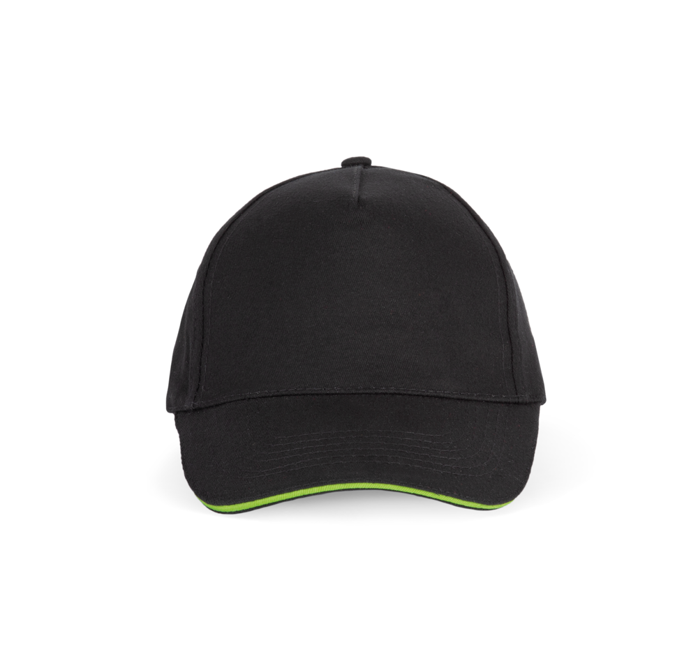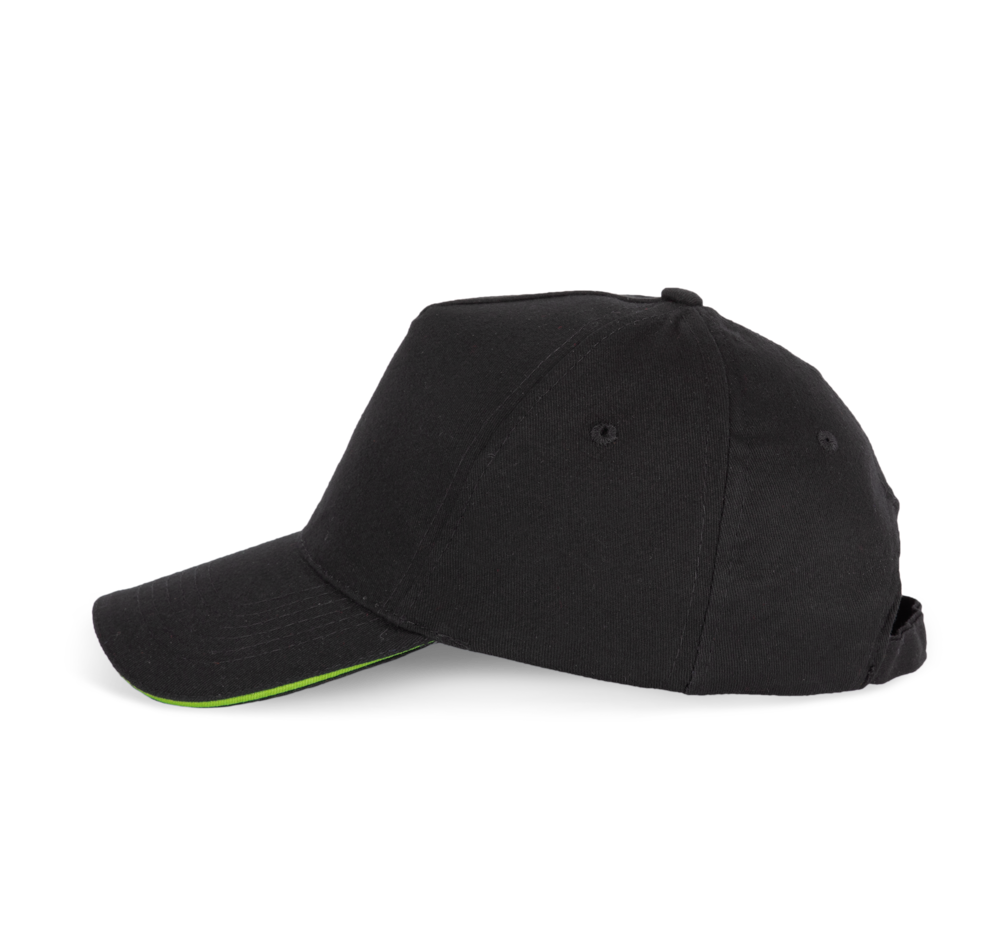 100% stark gebürstete Baumwolle. Laminierte 5-Panel-Kappe. Sandwichschirms mit kontrastfarbenem Mittelstück. Baumwoll-Schweißband. Größenverstellbar durch Metallschnalle.