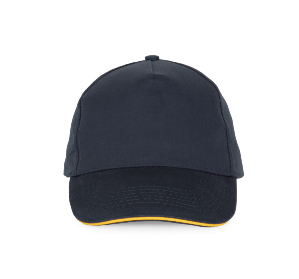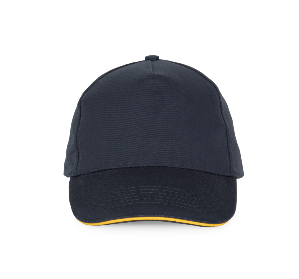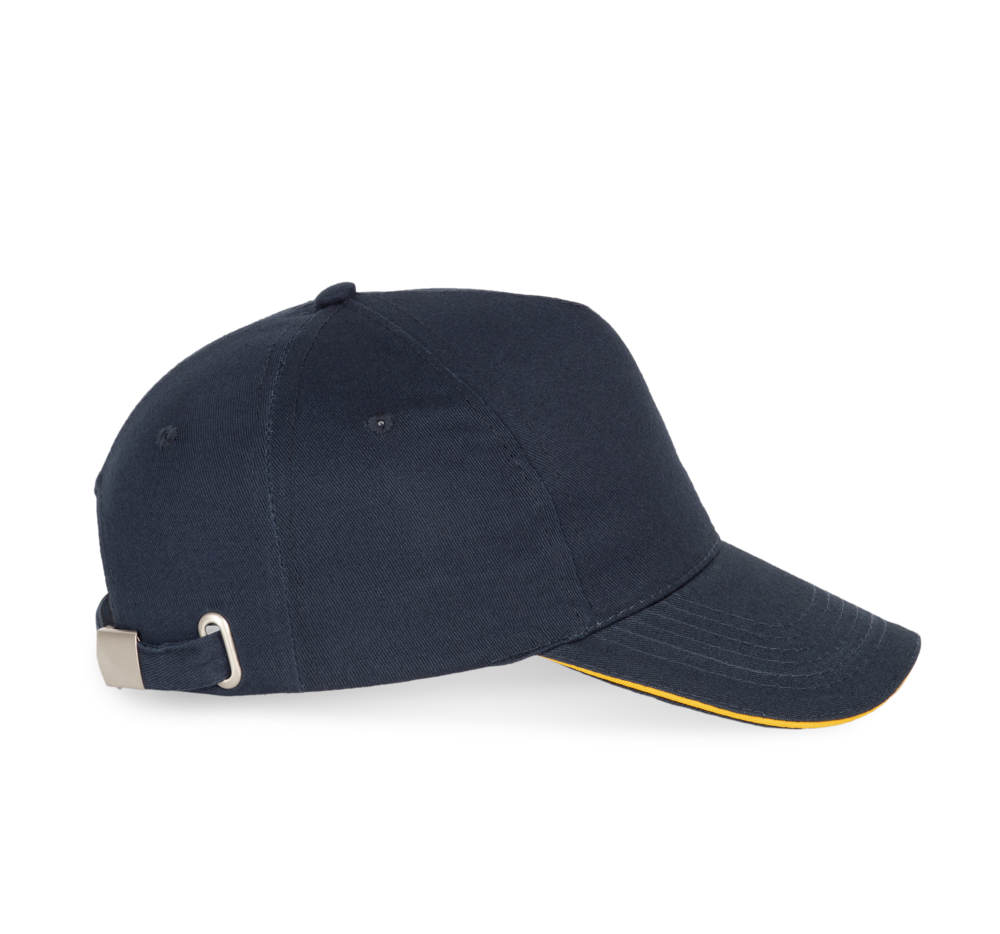 100% stark gebürstete Baumwolle. Laminierte 5-Panel-Kappe. Sandwichschirms mit kontrastfarbenem Mittelstück. Baumwoll-Schweißband. Größenverstellbar durch Metallschnalle.