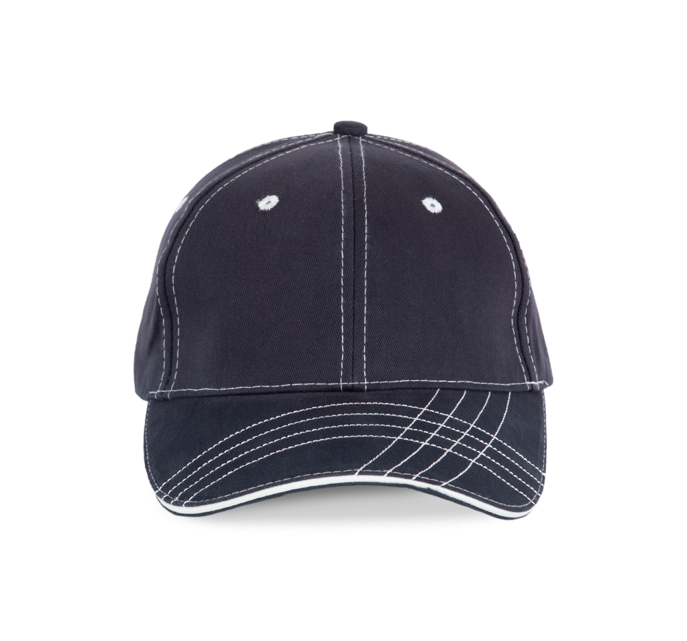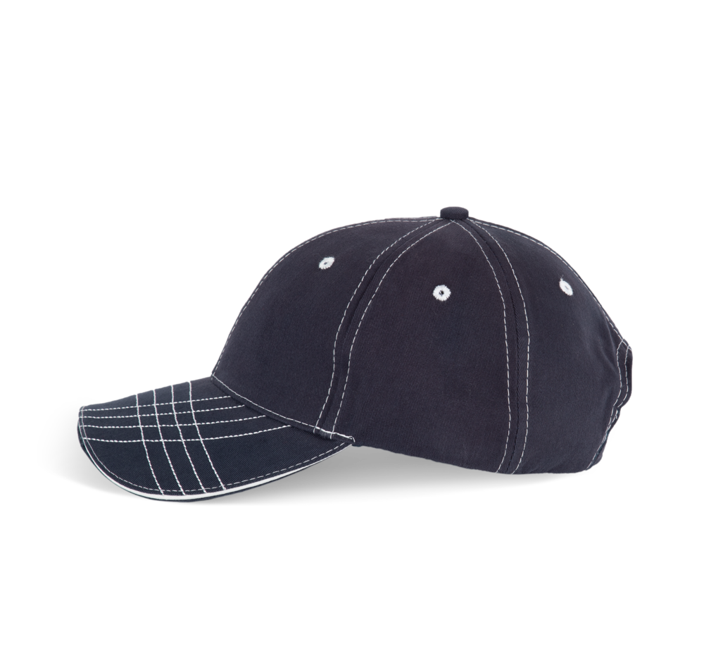 100% gebürsteter Baumwoll-Twill. 6-Panel, laminiert. Ösen und Nähte in Kontrastfarbe. Baumwoll-Schweißband.