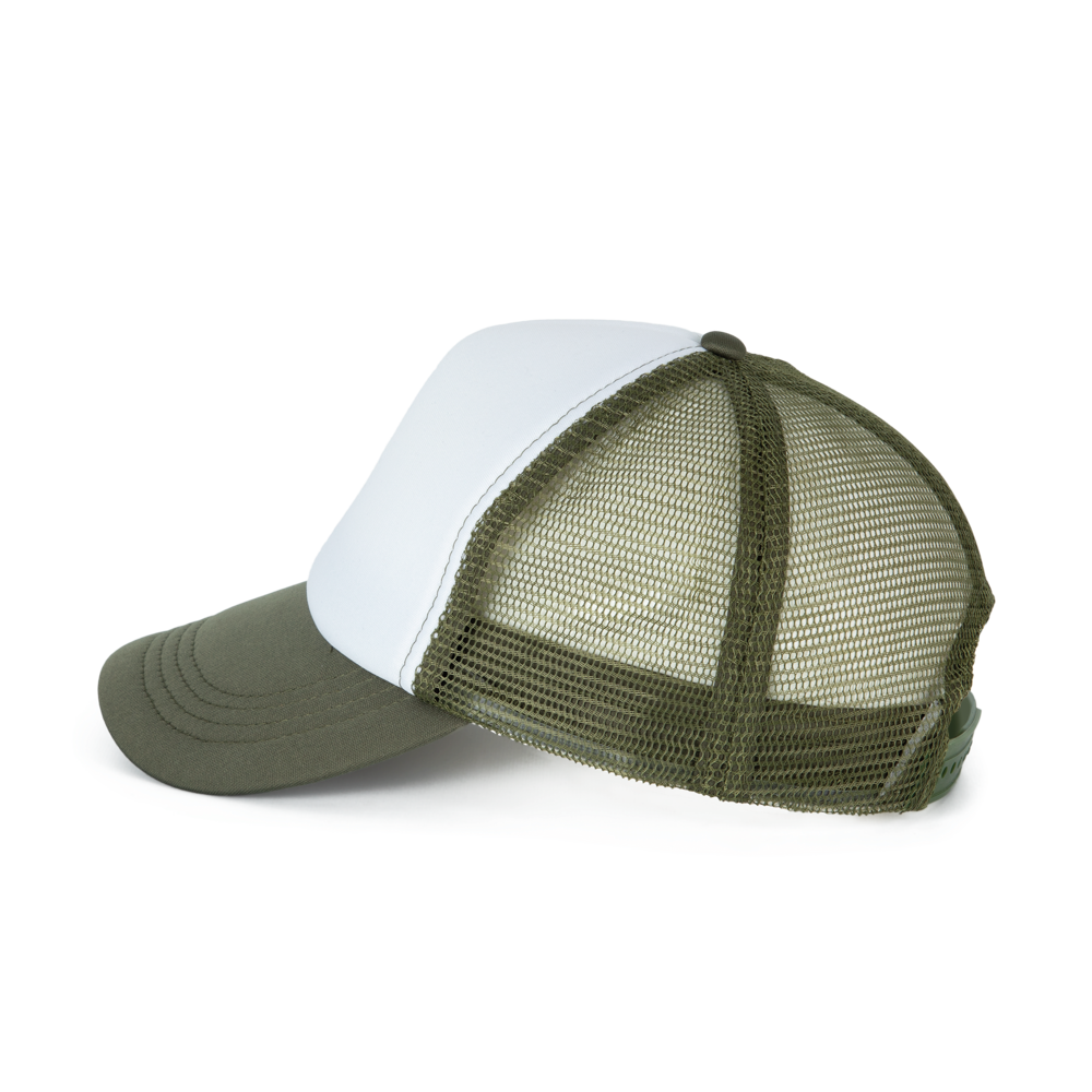 100 % Polyester mit Polyesternetz hinten. 5 Panels. Problemlose Veredelung auf vorderem Panel. Kunststoffschnalle zur Weitenregulierung. Kopfumfang: 53 cm.