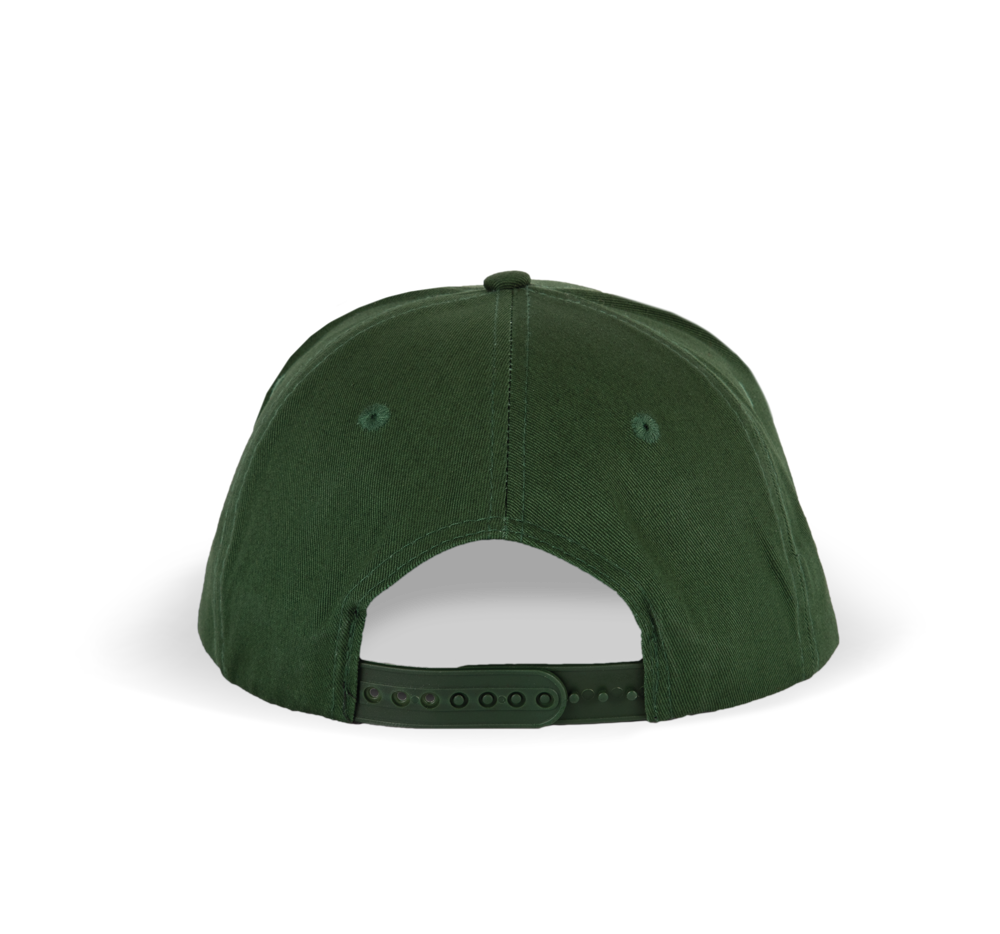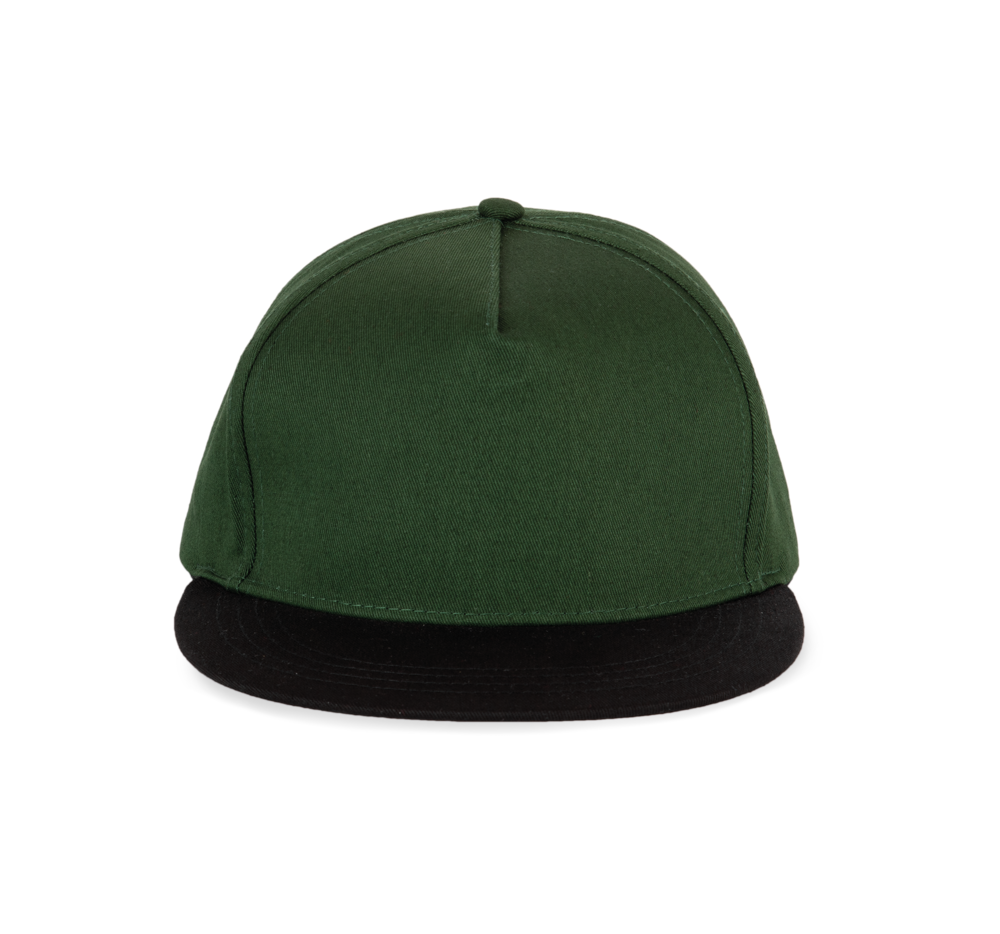100 % Baumwollserge. 5 Panel-Kappe. Flacher Schirm. Kunststoffschnalle zur Weitenregulierung.