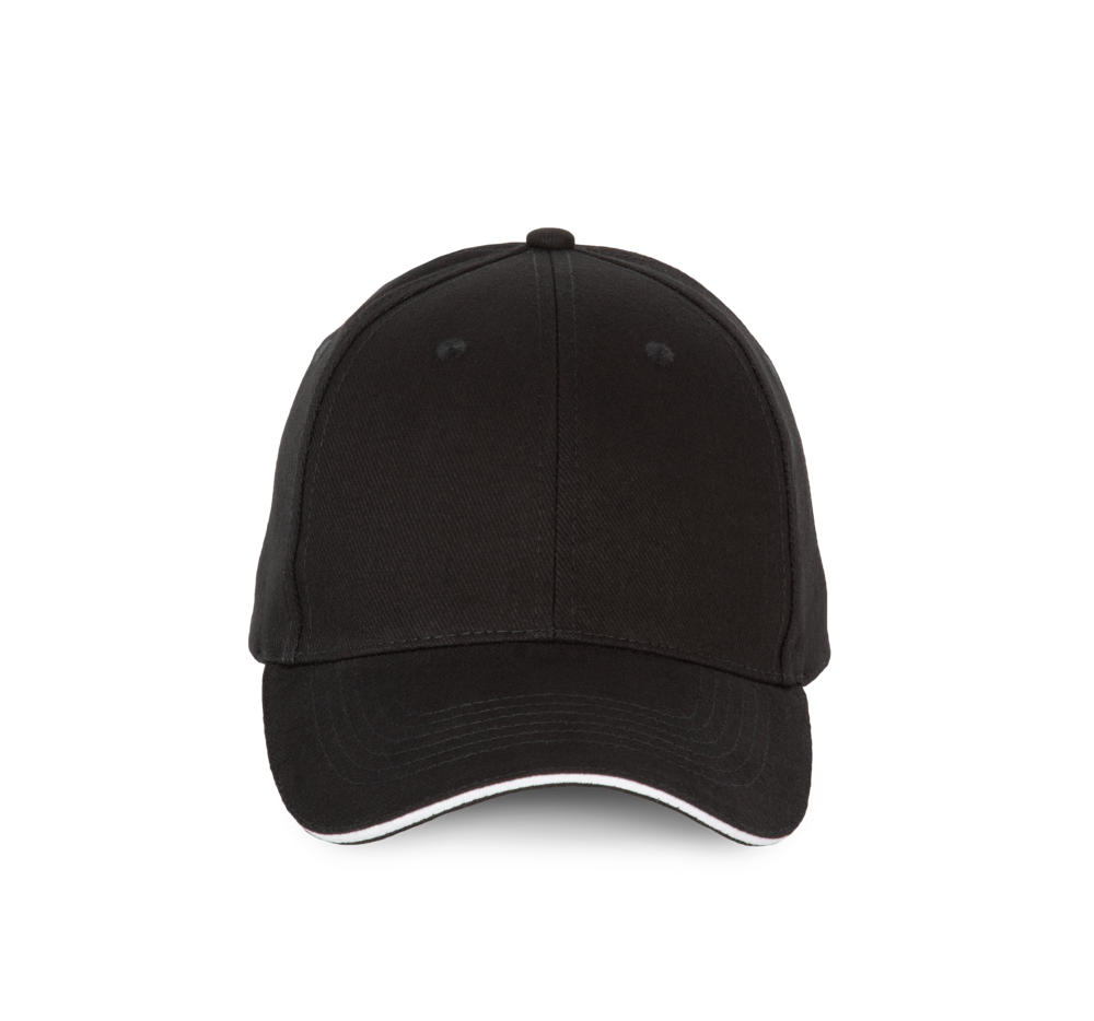 100 % Baumwolle. 6-Panel-Kappe mit Kontrast-Sandwichschirm. Über eine Metallschnalle verstellbarer Verschluss mit Schlaufe mit automatischer Bockierung.