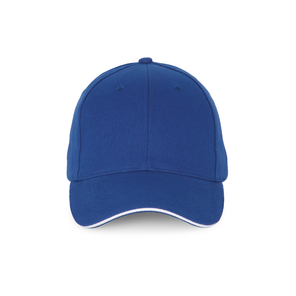 100 % Baumwolle. 6-Panel-Kappe mit Kontrast-Sandwichschirm. Über eine Metallschnalle verstellbarer Verschluss mit Schlaufe mit automatischer Bockierung.