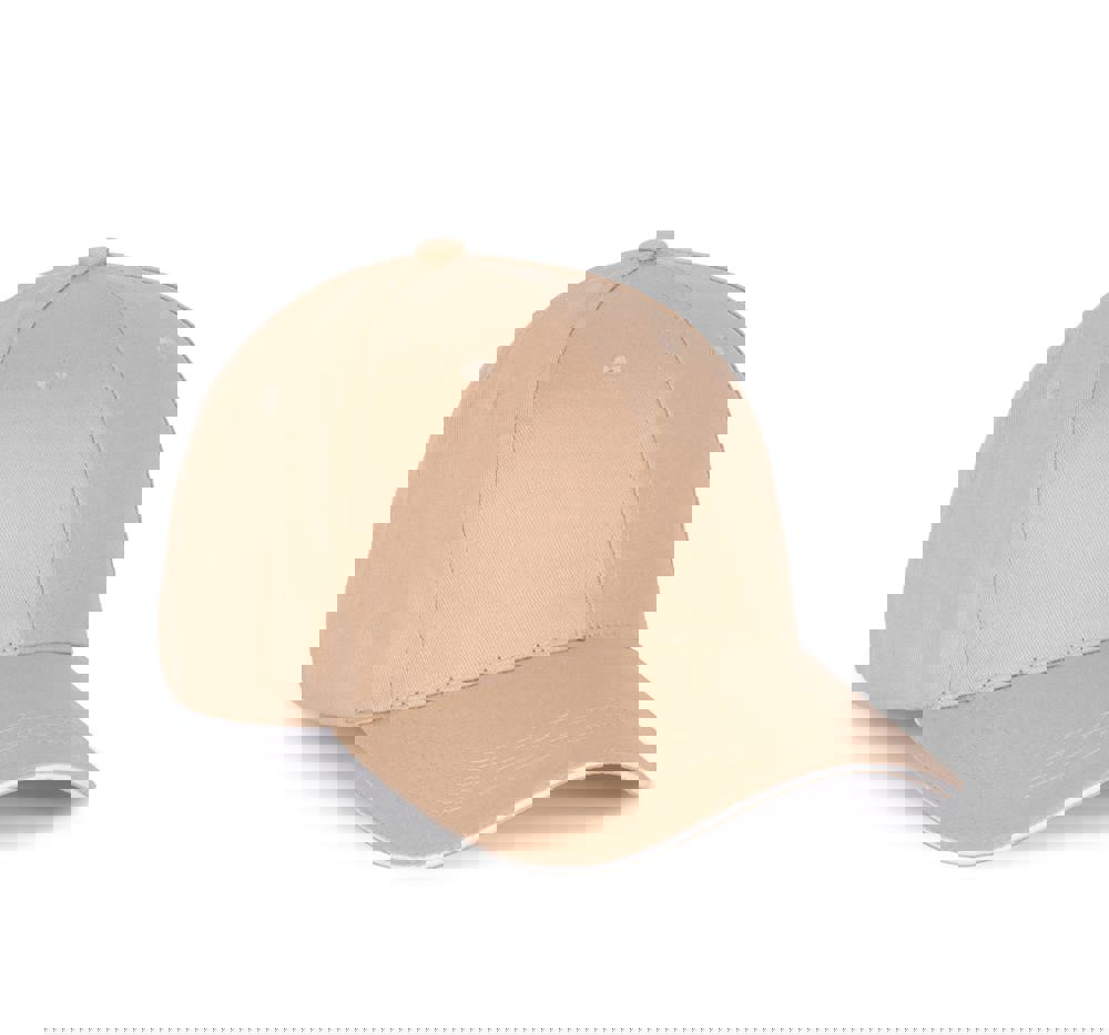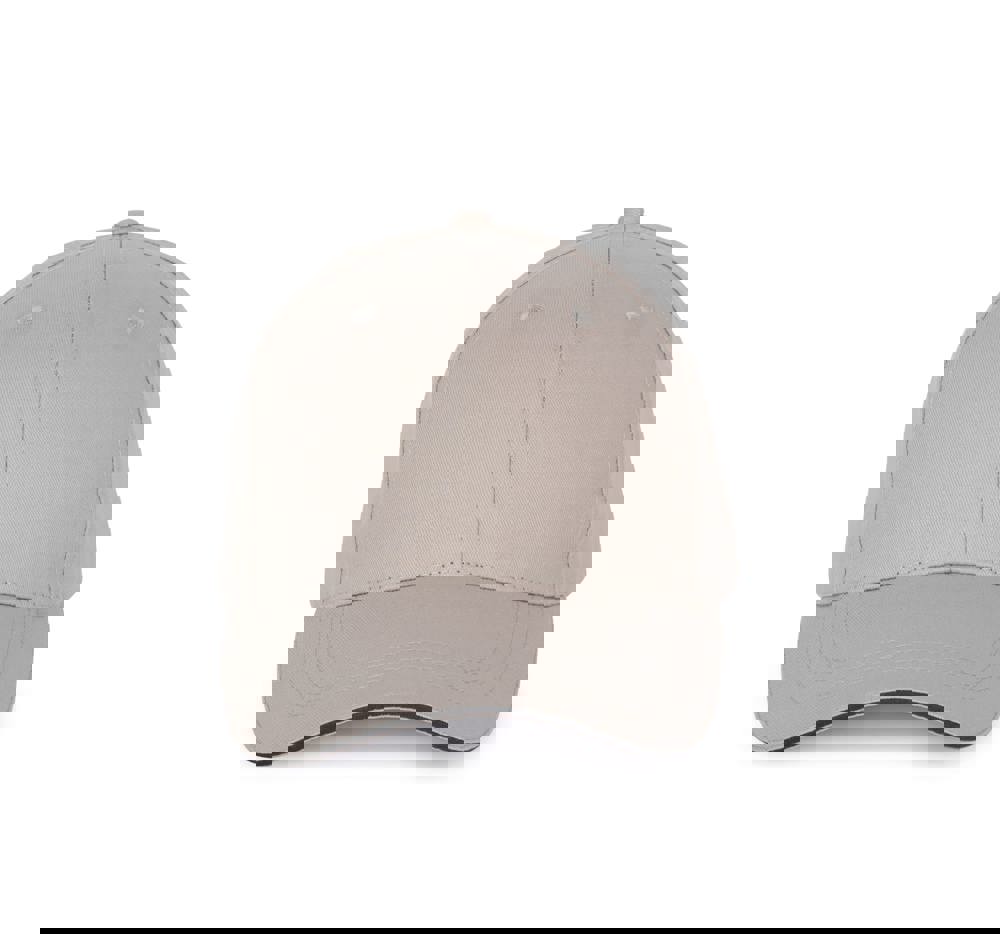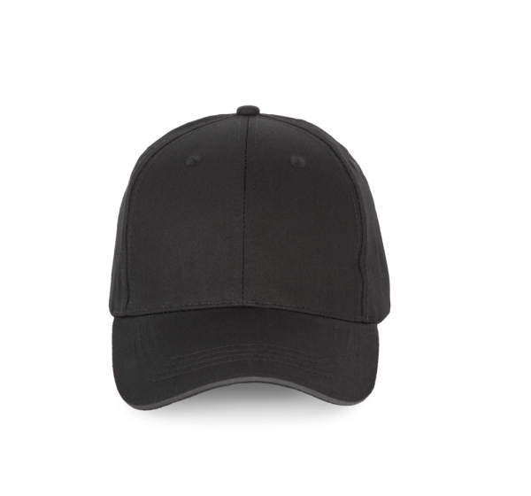 100 % Baumwolle. 6-Panel-Kappe mit Kontrast-Sandwichschirm. Über eine Metallschnalle verstellbarer Verschluss mit Schlaufe mit automatischer Bockierung.