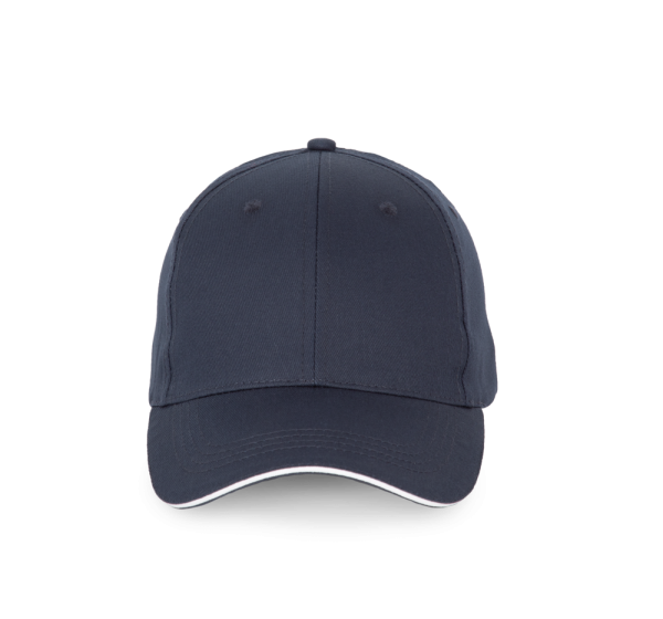 100 % Baumwolle. 6-Panel-Kappe mit Kontrast-Sandwichschirm. Über eine Metallschnalle verstellbarer Verschluss mit Schlaufe mit automatischer Bockierung.
