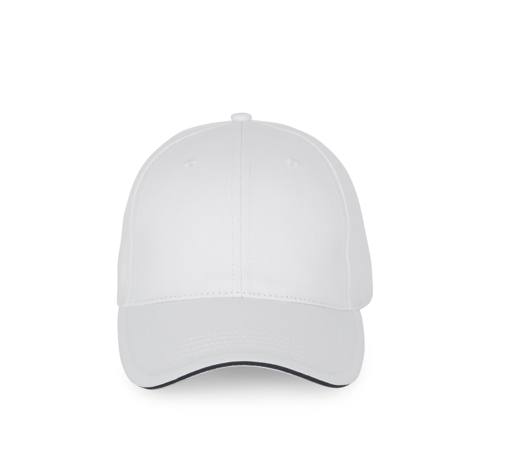100 % Baumwolle. 6-Panel-Kappe mit Kontrast-Sandwichschirm. Über eine Metallschnalle verstellbarer Verschluss mit Schlaufe mit automatischer Bockierung.